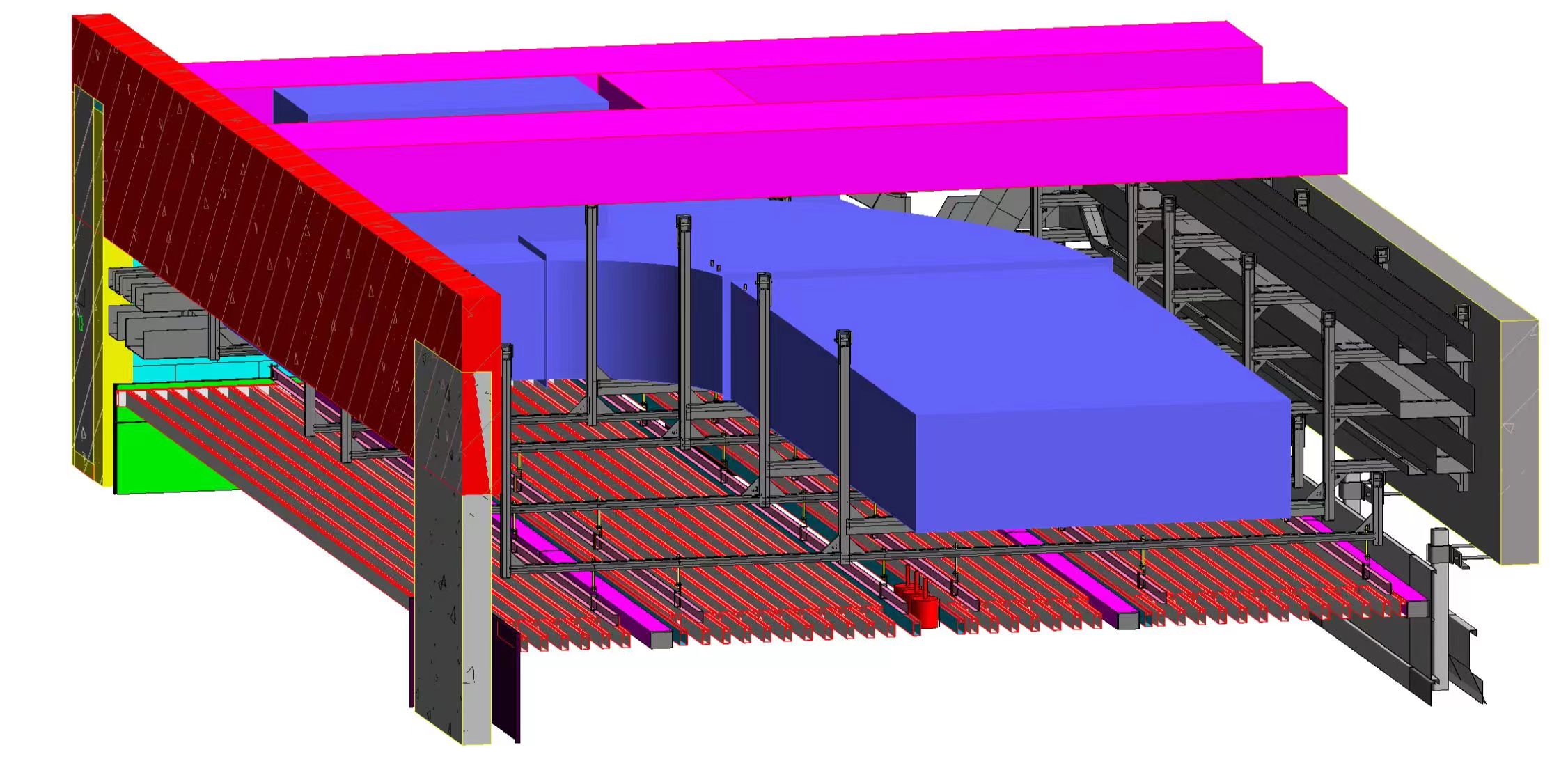 本工程分三個標段,合計總建筑面積為56.1萬㎡,建筑最高高度34.8m,其中一、三標段為多層大跨度鋼結(jié)構(gòu)廠房。眾所周知,對于鋼結(jié)構(gòu)廠房支架設(shè)計一直是行業(yè)內(nèi)的難題。華固充分利用BIM技術(shù),自主研發(fā)的成品